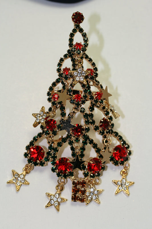Large Rhinestone Christmas Tree Brooch Dangle Star Ornaments Crystal Red Green, Crystal Xmas tree Holiday Jewelry Gift