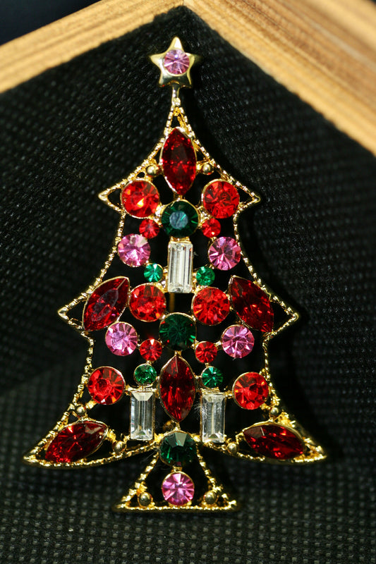 Rhinestone Christmas Tree Brooch, Vintage Gold-Tone Diamond Emerald Ruby Xmas Tree Brooch Pin, Holiday Jewelry