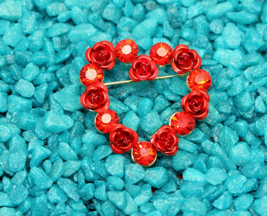 Red Ruby Rhinestone Heart with Roses Brooch Pin, Valentine's Day Heart, Valentine's Day Jewelry Gift
