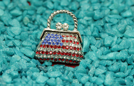 Rhinestone Fashion 4th July USA Flag Purse Handbag Pin Brooch, Patriotic Red White Blue Jewelry Gift