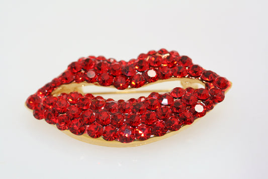 Sexy Ruby Red Pair of Lips Kiss Love Pave Rhinestone Crystal Brooch Pin Gold