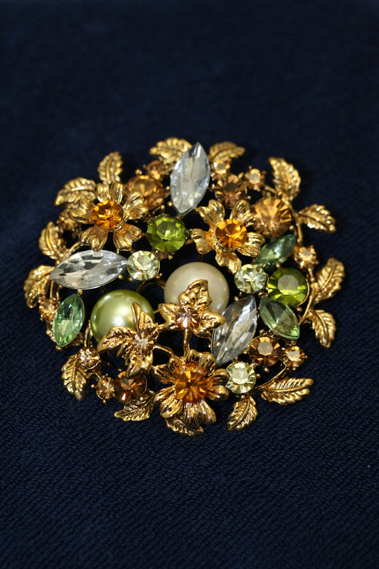 Round 3D Christmas Flower Wreath Brooch, Vintage CZ Crystal and Pearl Pin, Exquisite Luxury Christmas Fall Jewelry