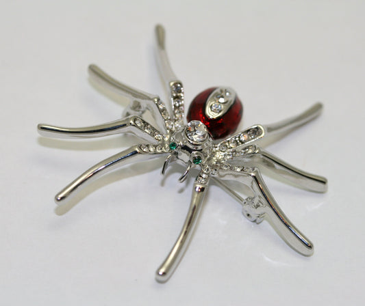 Silver Plated Clear Rhinestone and Red Enamel Spider Brooch Halloween Spider Pin, Holiday Costume Jewelry