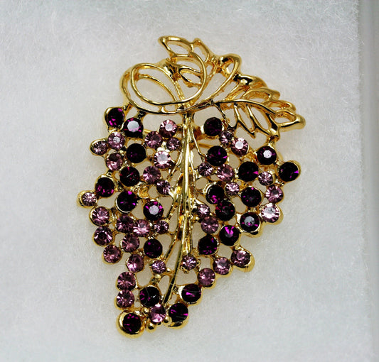 Vintage Grapes on Vine Brooch Pin Gold Tone Purple Rhinestone Grapes Statement Brooch