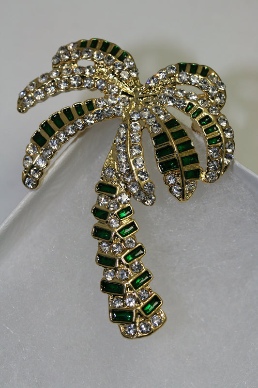 Vintage gold tone metal rhinestone palm tree brooch, Crystal palm tree pin