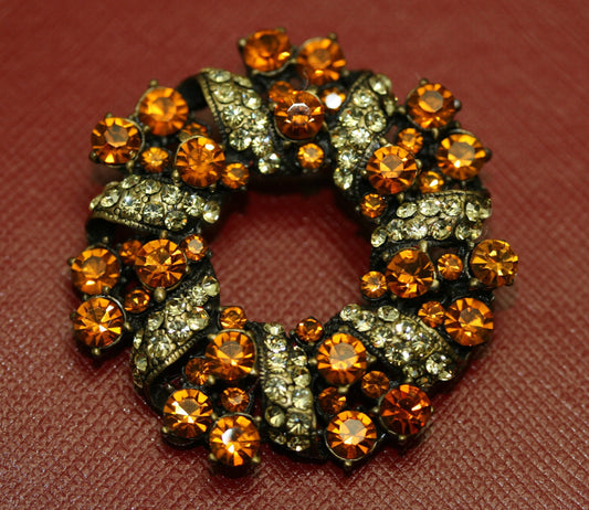Vintage Golden Rod Citrine Colored Rhinestones Floral Leafy Wreath Brooch Pin and Pendant