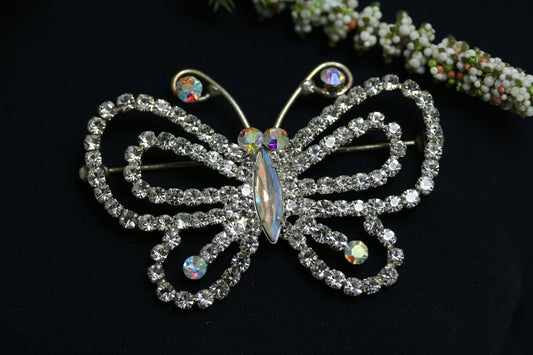 Silvery Tone Aurora Borealis Clear Crystal Rhinestone Hollow Out Butterfly Brooch Pin