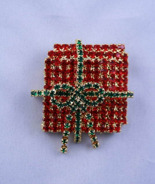Vintage Large 3D Rhinestone Christmas Gift Box Brooch, Holiday Crystal Present Box Pin, Holiday Jewelry.