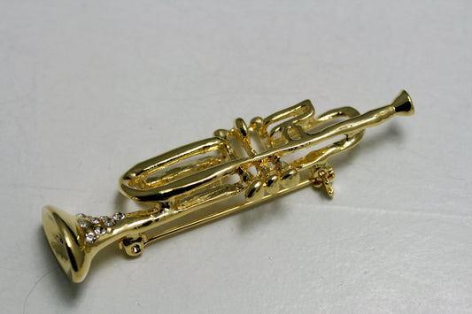 Gold Tone Rhinestone Trumpet Pin Brooch, Crystal Music Instruments Brooch