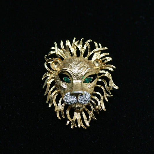 Large 3D LION Head Cat Green Eyes Rhinestone Brooch Pin And Pendant In Gold-tone