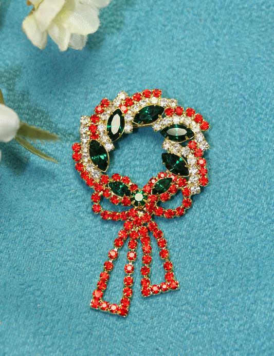 Vintage Christmas Wreath Rhinestone Pin Brooch, Christmas Holiday Jewelry