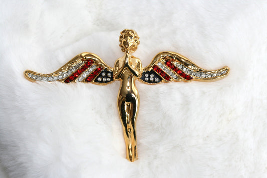 Vintage Flying Angel with Crystal USA Flag Wings Brooch Gold Tone