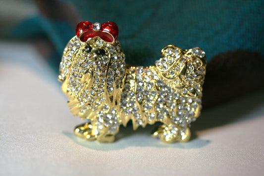 Yorkie Dog PIN BROOCH Enamel Red Bow White Crystals Rhinestones Yorkshire Terrier Dog Pin