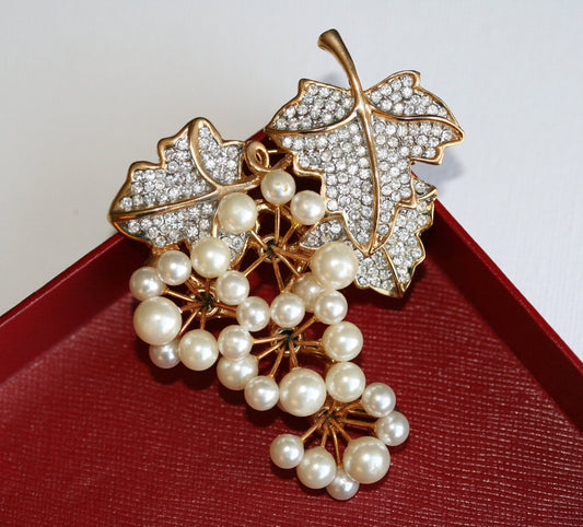 Vintage Pave Rhinestones & Faux Pearls Gold Tone Grape Bunch Brooch Pin