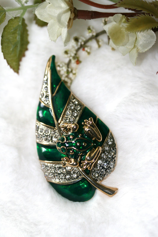 Rhinestone Frog Pin on Lily Pad, Frog on the Leaf brooch.