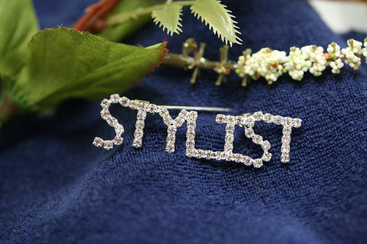 Rhinestone Word Pin "STYLIST", Beauty Salon Designer STYLIST Word Letters Scissors Brooch Pin Jewelry