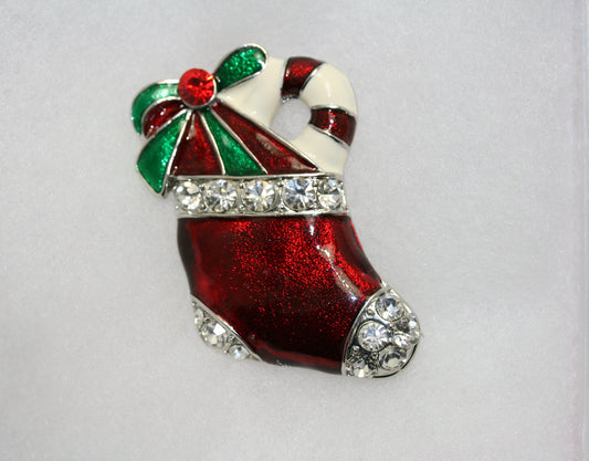 Red Enamel Rhinestone Christmas Stocking Pin Brooch, Xmas Stocking pin, Christmas Jewelry