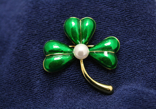 St. Patrick's Day Three Leaf Clover Brooch Pin With Pearl, Enamel Shamrock Pin, IRISH Jewelry Gift