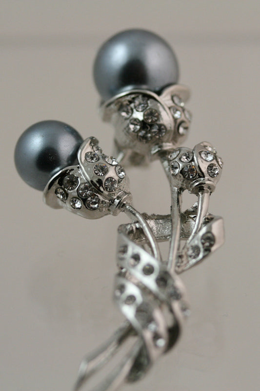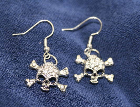 Vintage Rhinestone Antique Silver Skull & Crossbones Earrings for Pierced Ears Pirate Themed
