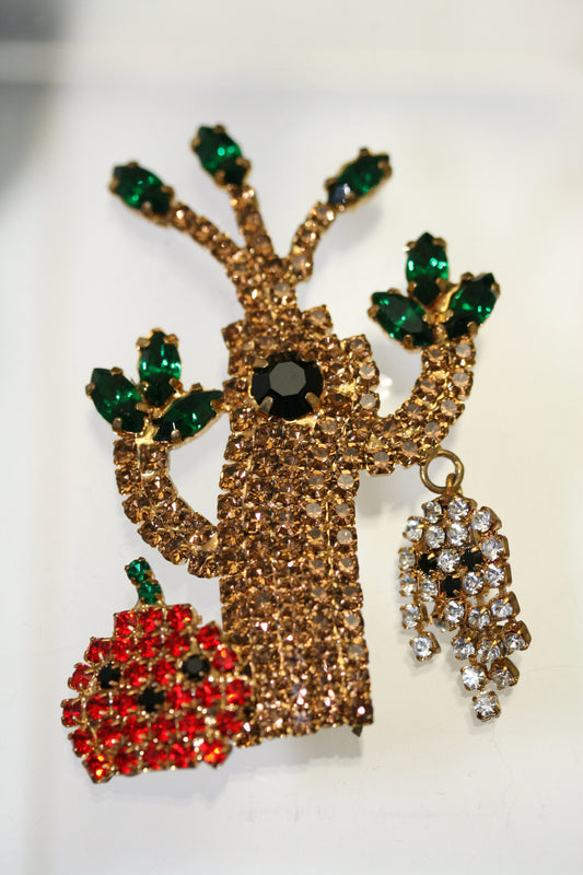Vintage Crystal Gold-Tone Christmas Tree Brooch Pin, Rhinestone Christmas Jewelry