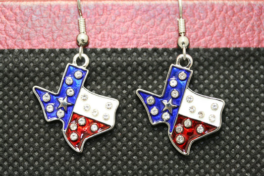 Rhinestone Patriotic Texan Texas Shape Flag Earrings, 4th of July Fashion Jewelry, Texan Jewelry,