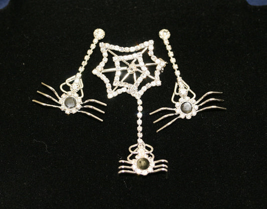 Rhinestone Spider Web Brooch Pin With Matching Earring, Crystal Halloween Jewelry Set