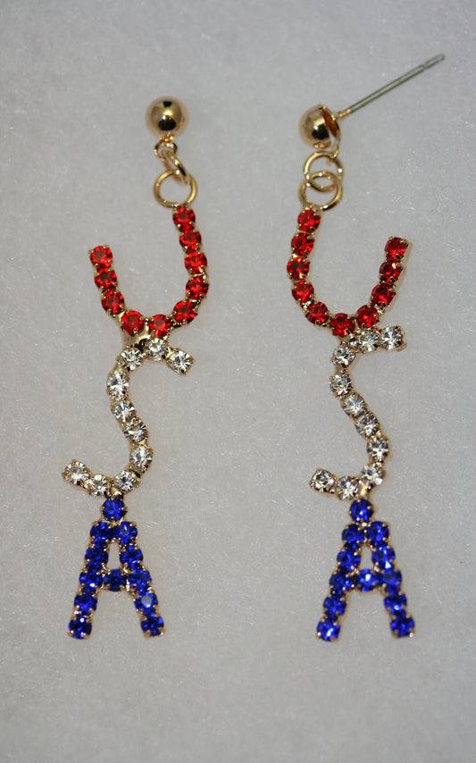 Rhinestone Patriotic Crystal USA Flag Post Dangle Earring Red White & Blue Letters