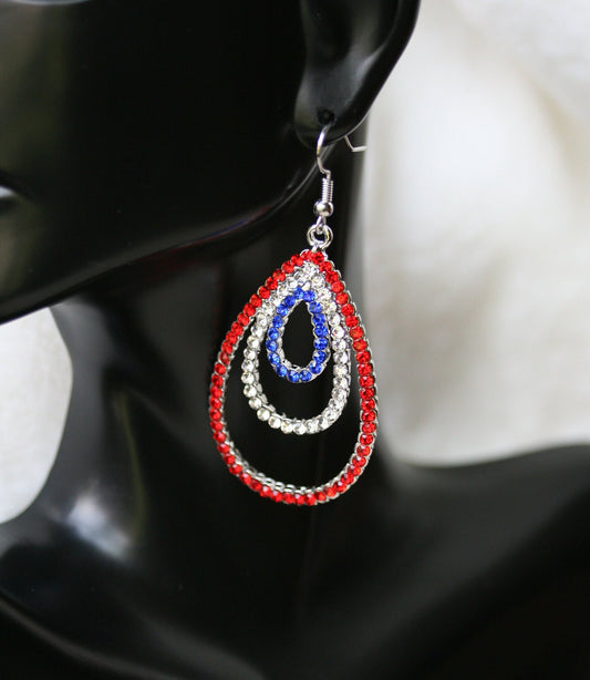 Rhinestone USA Patriotic 4th of July Red White Blue Teardrop Tripe Layer Dangle Earring