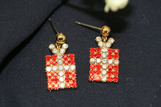 Xmas Christmas Gift Box Package Crystal Rhinestone Stud Earrings, Holiday Earrings Jewelry Gift