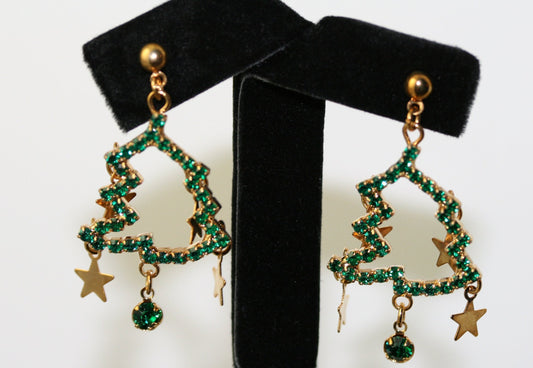 Vintage Rhinestone Dangling Christmas Tree Earrings, Holiday Fashion Jewelry, Xmas Jewelry Gift for Women