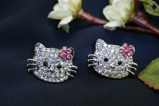 Silver Hello Kitty Rhinestone Brooch, Cat Pin with Pink Flower Kitty Bling, Crystal Hello Kitty Earrings