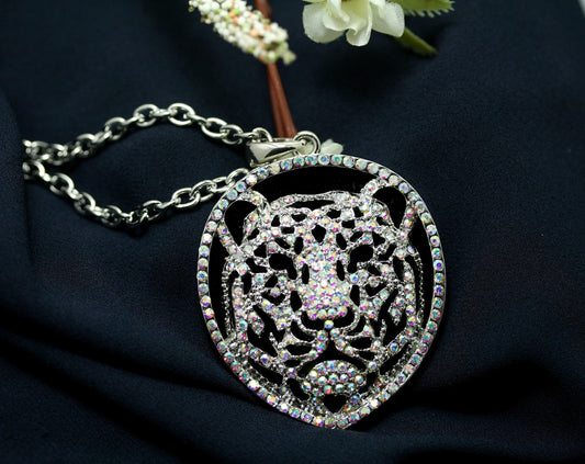 Vintage Silver-plated Leopard Tiger Head Crystal Pendant Chain Necklace