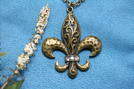 Vintage Rhinestone French Flower Fleur de Lis Pendant in Gold Antique Brass USA Metals Fleur De Lis Necklace
