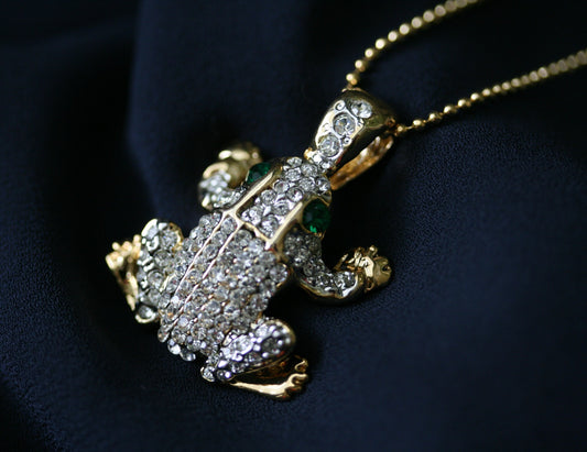 Vintage Clear Rhinestone Frog Pendant On Chain, Crystal Frog Necklace Two Tone, Animal Frog Jewelry