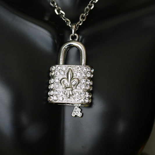Vintage Fleur De Lis Jewelry Stunning Pave Crystal Rhinestone Lock with Key Pendant Necklace